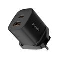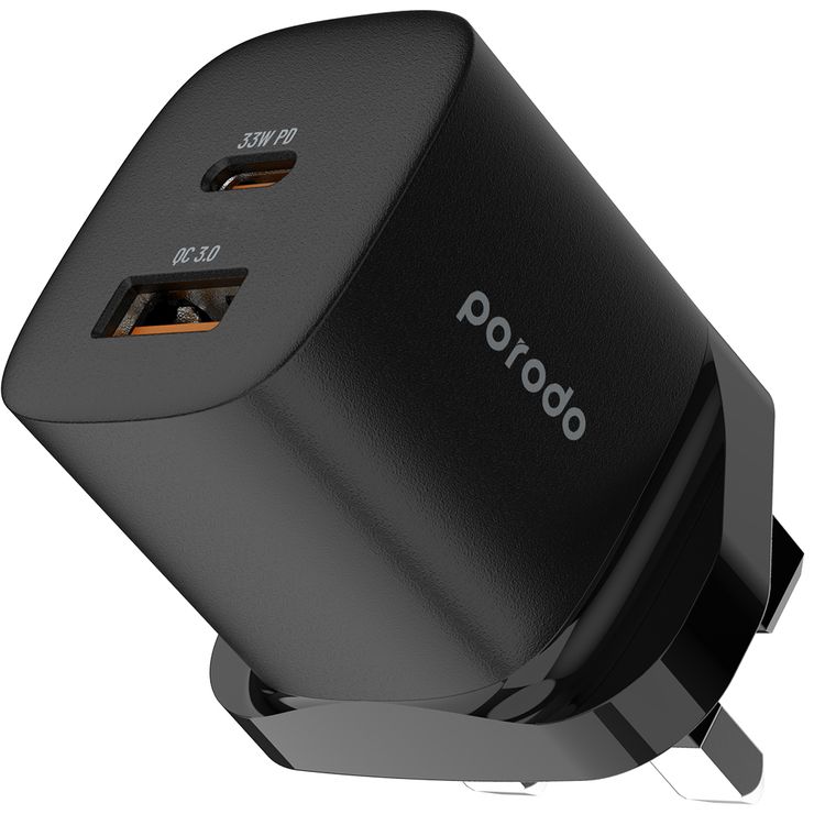 Porodo GaN Quick Charger Power Adapter with 33W Power Delivery, Simultaneous Charging, 30W USB-A Output, UK 3-Pin Plug, 0% to 60% Charge in 35 Minutes, Fast Charging Support - Black