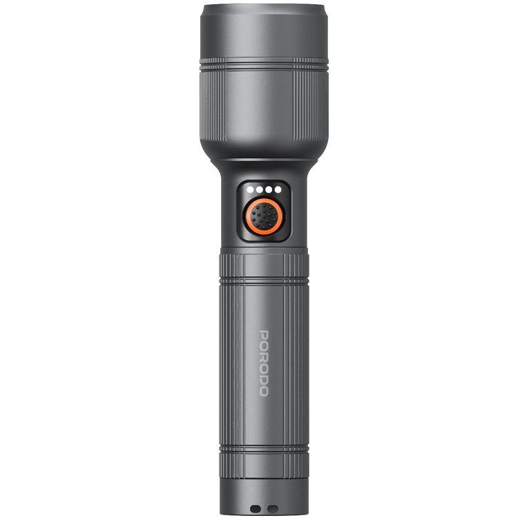 Porodo Rechargeable Flashlight with 500m Coverage, 150 Lumens Brightness, 2000mAh Battery Capacity, Type-C Charging Port, 84 Minutes Working Time, 4 Hours Charging Time, 500m Beam Distance, Multiple Mode Operation - Gray