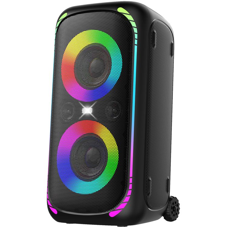 The Porodo Soundtec Bash X Party Speaker with Trolley is a dynamic and robust audio solution for any party or event. It features a powerful 2500mAh/14.8V battery, ensuring an extended playtime of up to 12 hours, perfect for long-lasting entertainment. The speaker is designed to be water-resistant with an IPX4 rating, making it suitable for outdoor use. It boasts the latest V5.3 Bluetooth connectivity for seamless wireless streaming. With a peak power of 640W, this speaker delivers high-quality, loud, and clear audio, suitable for large gatherings. The recharge time is impressively short at just 2.5 hours. Additionally, the speaker comes with a microphone port, making it ideal for events where announcements or performances are needed. The flashing light feature adds to the festive atmosphere, creating a dynamic visual experience. Moreover, the inclusion of an FM radio broadens the range of entertainment options. The trolley design enhances its portability, making it easy to transport to various locations. This combination of features makes the Porodo Soundtec Bash X Party Speaker with Trolley a standout choice for anyone looking to host memorable events with powerful and versatile audio capabilities.