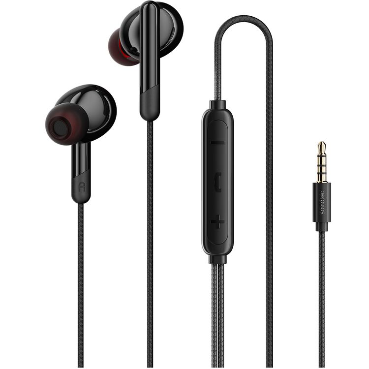 Porodo Soundtec Stereo Bass Wired Earphones with 3.5mm AUX Jack Connection, Plastic Shell + ABS & TPE Wire Material, 1.2m Wire Length, 3-Button Control, Ergonomic Design - Black