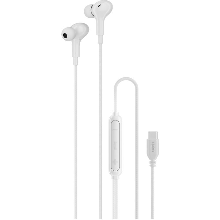 Porodo Soundtec Stereo Bass Wired Earphones with Type-C Connection, Plastic Shell + ABS & TPE Wire Material, 1.2m Wire Length, 3-Button Control, Ergonomic Design - White