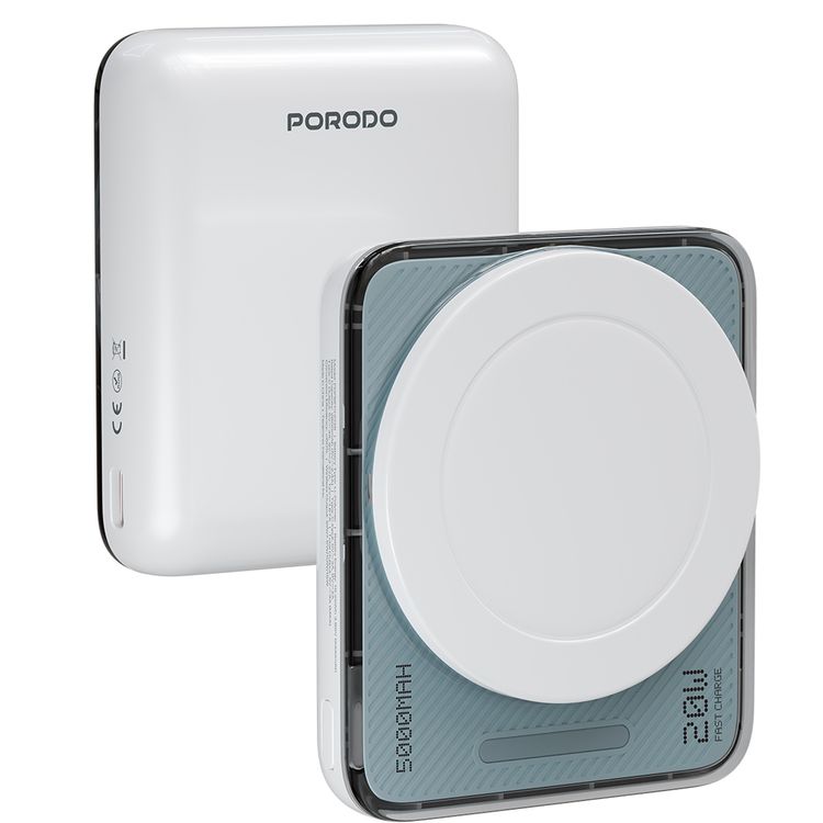 Porodo Sovo 5000mAh Power Bank with MagSafe Compatibility, Charging LED Light, USB-C Input & Output Port, PD 20W Fast Charging, 15W Wireless Output, Compact Design - White