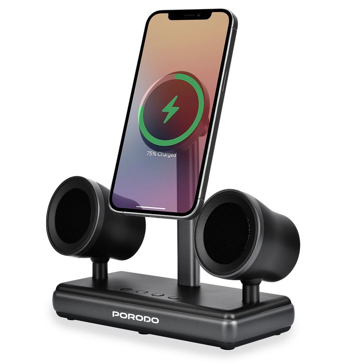 Porodo Speaker Charging Dock with Qi2 Wireless Charging, Compatible with iPhone 12 to 16 Series, 16W Dual Speakers, Built-in Safeguards, HiFi Audio - Black