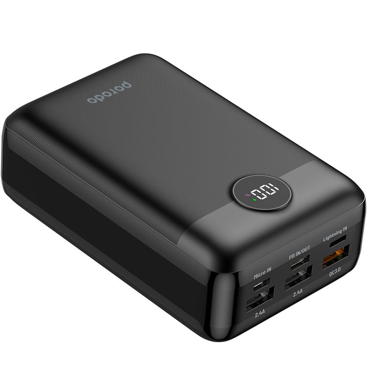 Porodo Super Compact Power Bank with 30000mAh Battery Capacity, 20W Power Delivery, Quick Charge 3.0 Technology, 4-Output Fast Charging, 22.5W USB-A QC Output - Black