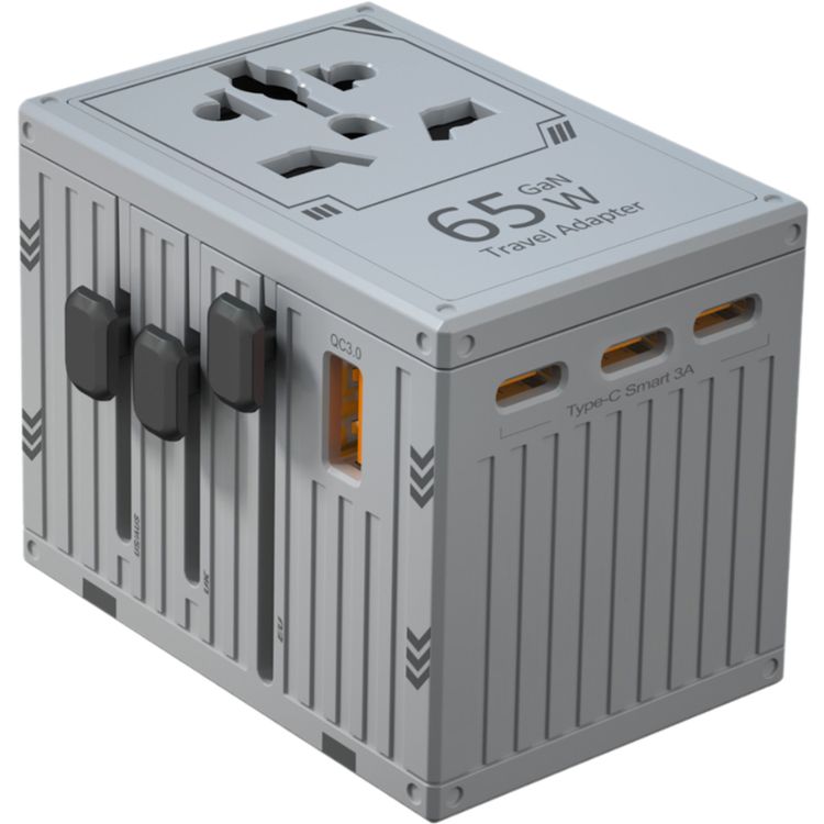 Porodo Travel Universal Charger, Dual Fuse, PD 65W, 4 USB-C & 1 USB-A Ports, UK, EU, US & AU Supported Plugs, GaN Technology - Gray