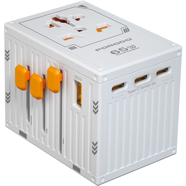 Porodo Travel Universal Charger, Dual Fuse, PD 65W, 4 USB-C & 1 USB-A Ports, UK, EU, US & AU Supported Plugs, GaN Technology - White