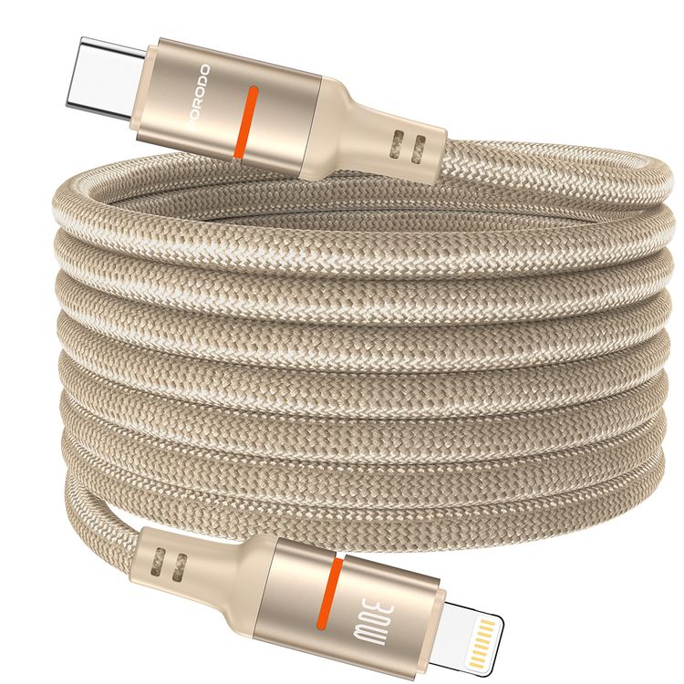 Porodo Type-C to Lightning Magnetic Braided Cable with 30W Power Delivery, 1.2m Cable Length, More than 15,000 Bends Lifespan, Tangle-Free Design - Gold