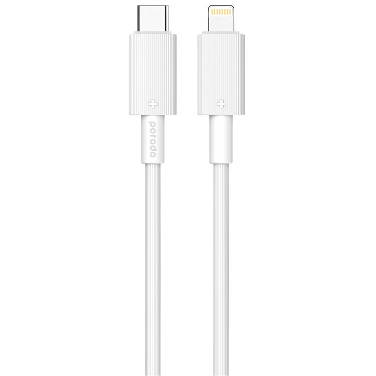 Porodo USB-C to Lightning PVC Cable, 480Mbps Transfer Speed, PD 27W, More than 15000 Bends Life Span, 1.2m Cable Length, Tangle Free - White