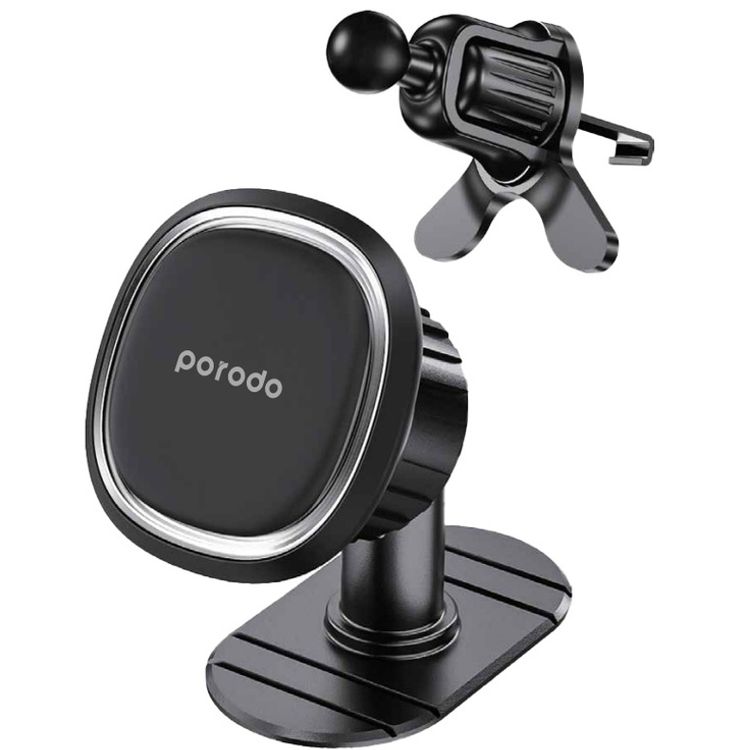 Porodo Universal Dual Mode Magnetic Phone Mount with Rotating Ball Joint, Strong Magnetic Hold, One-Hand Operation, Portable & Ultra Compact Design - Black