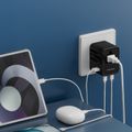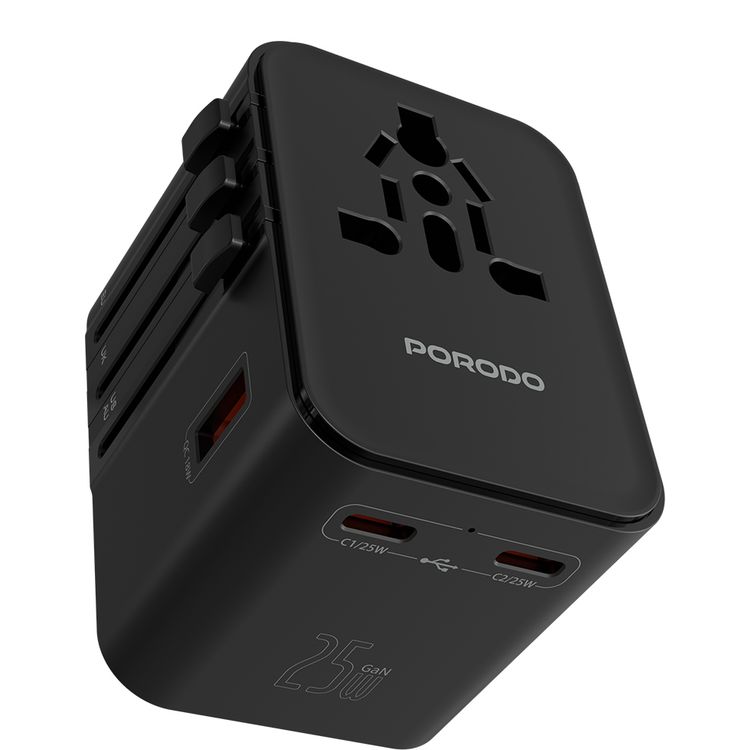 Porodo Universal Travel Multi-port Quick Charger with 2500W Max Rated Power, 15W Max Total Output, 18W Max USB-C Outputs (PD), 18W Max USB-A Output, 1m 4-in-1 Braided Cable, GaN Fast Charging Technology, Built-in Safety Protection - Black