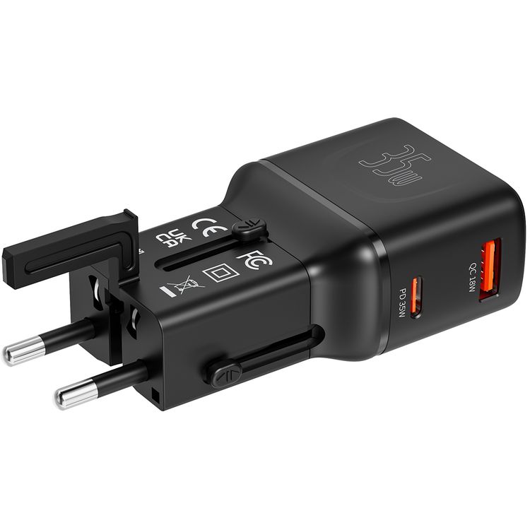Porodo Universal Travel Pocket Charger with 800mA Battery Capacity, Supported UK, EU, US & AU Plugs, 35W Mini Universal Charger, USB-A & USB-C Ports, Built-in Safeguards, 200+ Countries - Black