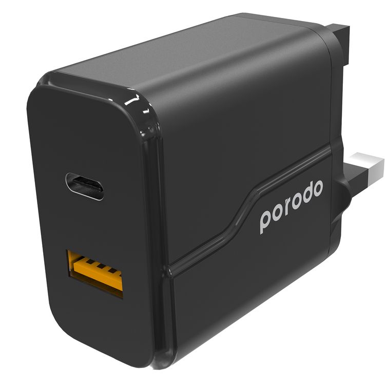 Porodo Dual Port Wall Charger with Type-C to Lightning Cable, 20W Power Delivery, QC 18W, Fire Retardant Material, Overcurrent Protection, UK 3-Pin Plug, Built-in Protective Mechanisms - Black