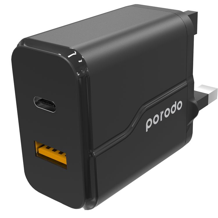 Porodo Dual Port Wall Charger with 20W Power Delivery, QC 18W, Fire Retardant Material, Overcurrent Protection, UK 3-Pin Plug, Built-in Protective Mechanisms - Black