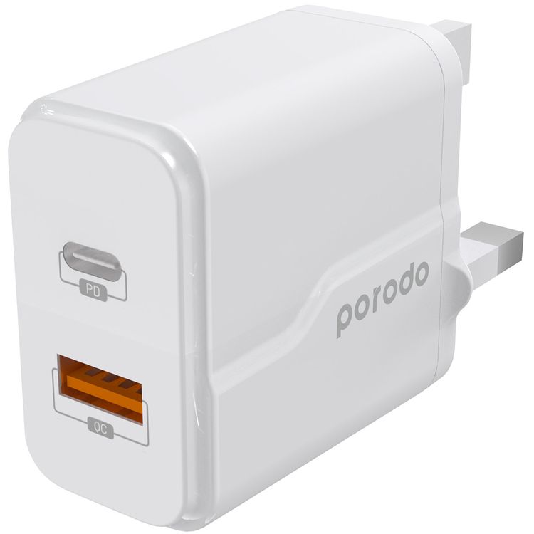 Porodo Dual Port Wall Charger with 20W Power Delivery, QC 18W, Fire Retardant Material, Overcurrent Protection, UK 3-Pin Plug, Built-in Protective Mechanisms - White