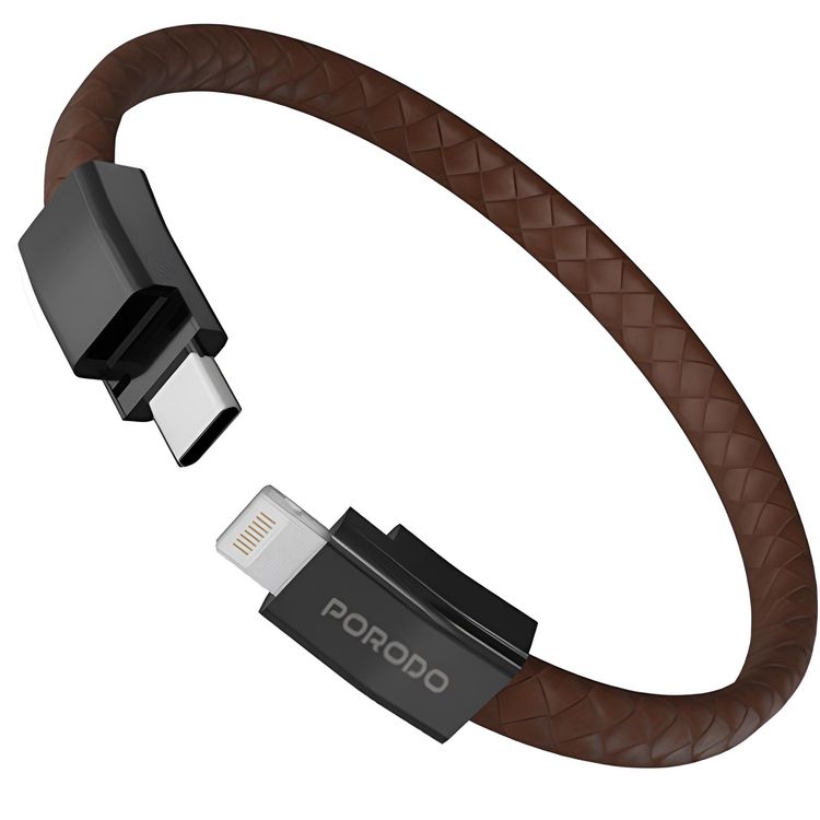 Porodo USB-C to Lightning Wristband Cable with Magnetic Steel Clasp, 27W Power Delivery, 480Mbps Data Transfer Speed, Wearable Design, 20cm Cable Length, PU Leather & Zinc Alloy Material - Brown