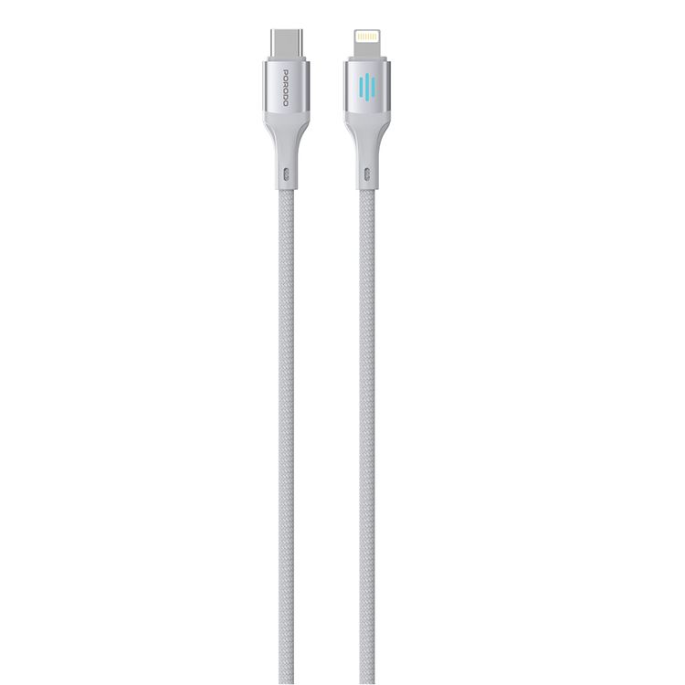 Porodo USB-C to Lightning Charging & Data Cable with 27W Power Delivery, 1m Cable Length, Braided Cable with Tangle-Free Design, 480Mbps Data Transfer Speed, Fast Charge - Silver
