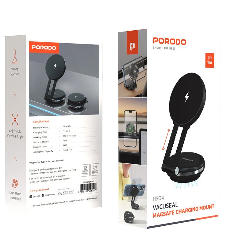 Porodo Vacuseal Magsafe Charging Mount with 120mAh Battery Capacity, Up to 45 Days Working Time, One-Hand Operation, Strong Suction & Adjustable Viewing Angle - Black
