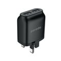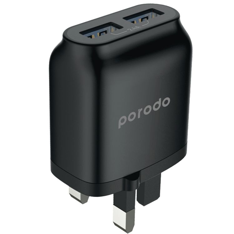 Porodo Dual Port UK Wall Charger with Fast Charging & Auto ID Support, 2.4A USB-A Current, Fireproof Material, Overheat Protection, Protective Safeguard - Black