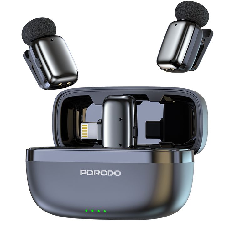 Porodo Wireless Lavalier Microphones with Lightning Connector, Noise Reduction, 33 Hours Working Time with Charging Case, 250mAh Case Battery Capacity, <22ms Latency, Plug & Play - Black