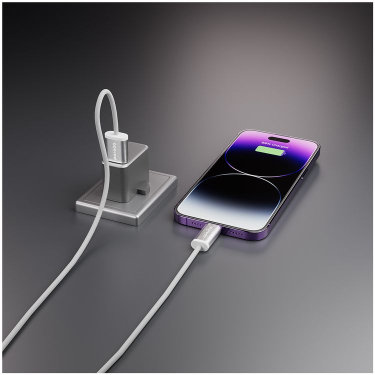 Porodo Woven Braided USB-A to Lightning Cable with 1.2m Cable Length, Fast Charge & Data Transmission, Tangle Free Design, High-Grade Components - White