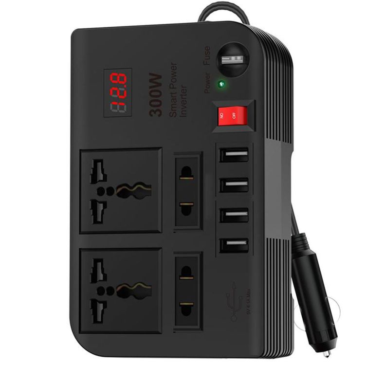 Green Lion Spark 3 Car Power Inverter with 300W Maximum Power, Overheat & Overload Protection, LED Display, Cooling Fan, 4 USB & 4 AC Outlets - Black