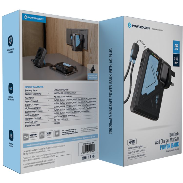 Powerology 10000mAh MagSafe Power Bank with Built-in Wall Charger, 35W Power Delivery, 4-Device Charging, 15W Wireless Output, Built-in USB-C to USB-C Cable - Black