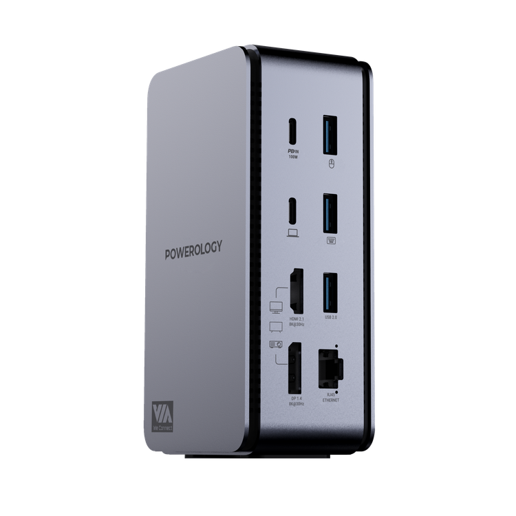 Powerology 15 in 1 Dual Dock Station, 40Gbps Data Speed, 100 Mbps Network Speed, PD 100W, 3.5mm Audio Jack - Gray