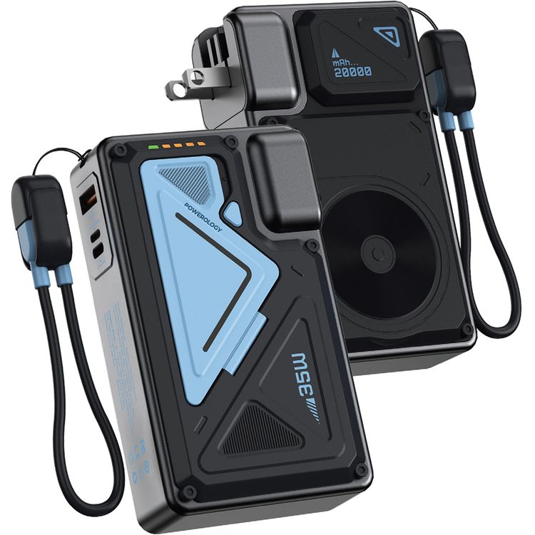 Powerology 20000mAh MagSafe Power Bank with Wall Charger, PD 35W, 15W Wireless Charger, On-Demand Kickstand, Single USB-A & USB-C & Lightning Ports, US/ EU/ UK Interchangeable Plugs - Black