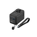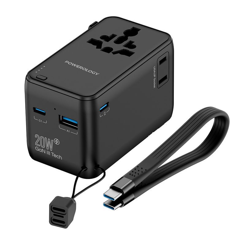 Powerology 20W PD Universal Travel Adapter with Built-in 4000mAh Power Bank, USB-A & Dual USB-C Ports, Universal Sockets, GaN III Technology, Supports PD & QC, Charges 5 Devices, Built-in Safety, Includes Spare Fuse, Flame Resistant, 200+ Countries - Black