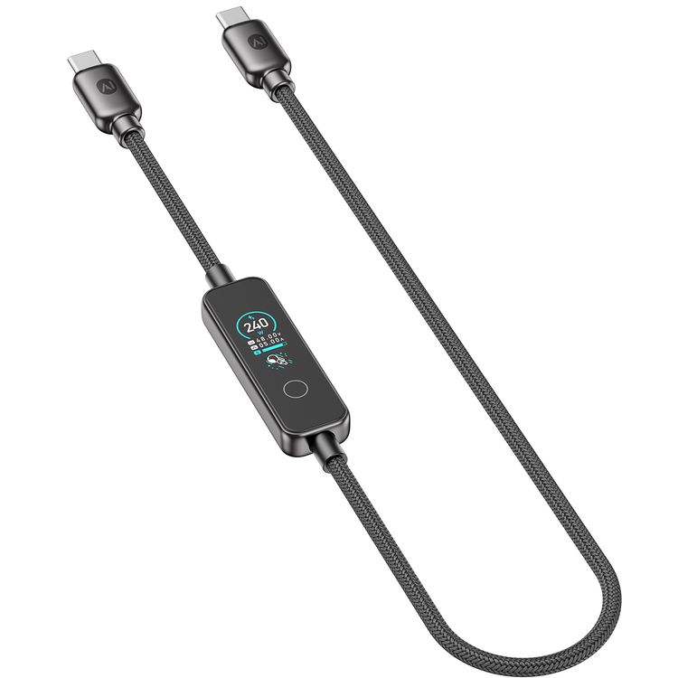 Powerology 240W USB-C to USB-C Cable with TFT Display, PD 3.1 Fast Charging, Advanced E-Marker Chip, 1.2m Cable Length, Durable Zink Alloy Shell - Black