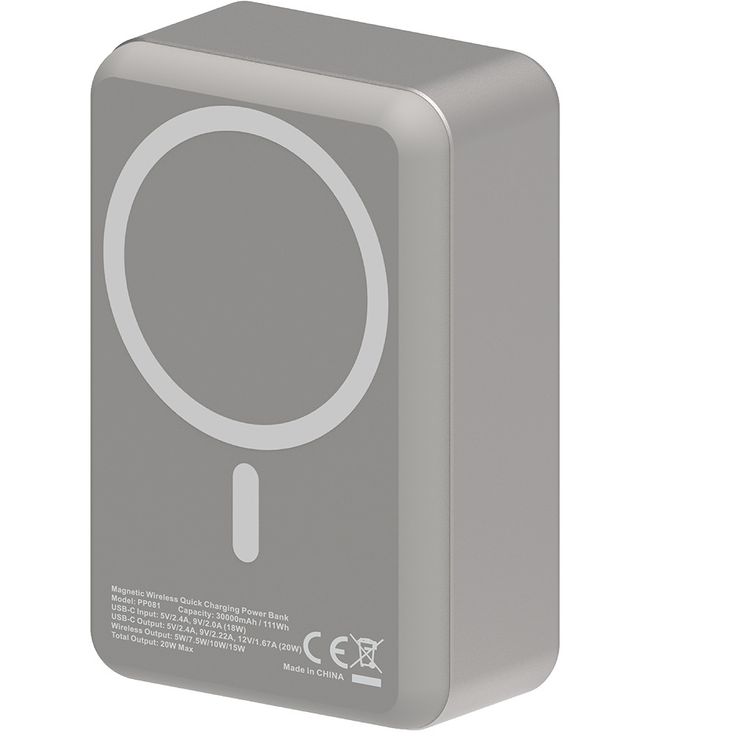 Powerology 30000mAh MagSafe Aluminum Power Bank with 20W Power Delivery, 15W Wireless Output, Li-Polymer Battery, Simultaneous Charging, Compact Design - Titanium