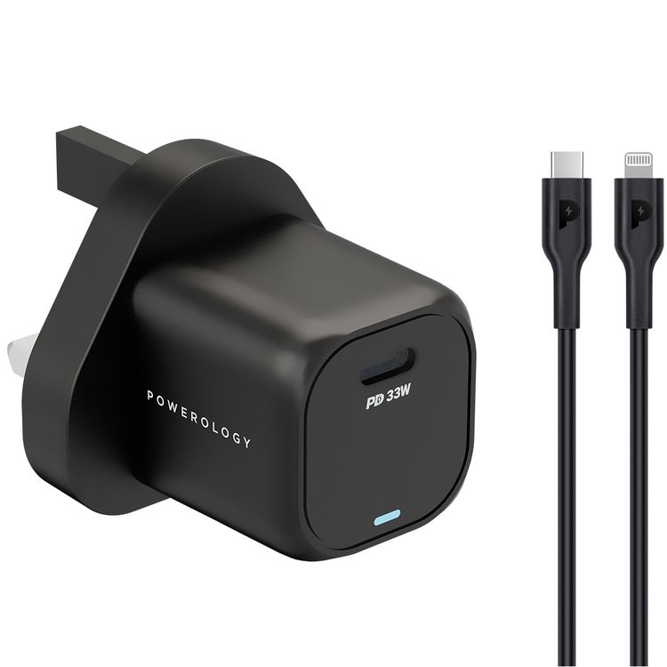 Powerology 33W GaN PD Charger with 1.2m USB-C to USB-C Cable, UK 3-Pin Plug, Built-in Safeguards, 0%-60% Charge in 30 Minutes, USB-C Fast Charging - Black