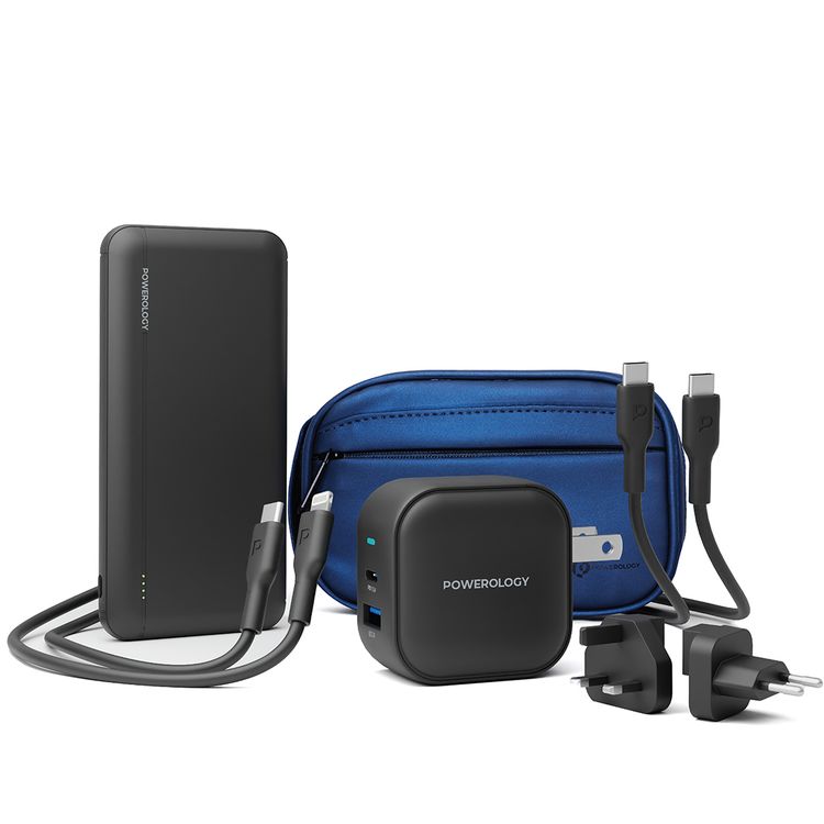 Powerology 5-in-1 Universal Power Combo with Power Bank, Universal Travel Charger & Fast-Charging Cables, 10000mAh PD Power Bank, 38W Charger, Carry Bag Included- Black