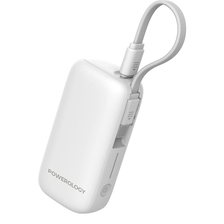 Powerology 5000mAh Power Bank with Removable USB-C Wire, Advanced Charging Technology, 2-Device Charging, Compact & Portable, Built-in Safeguards, 20W Power Delivery - White