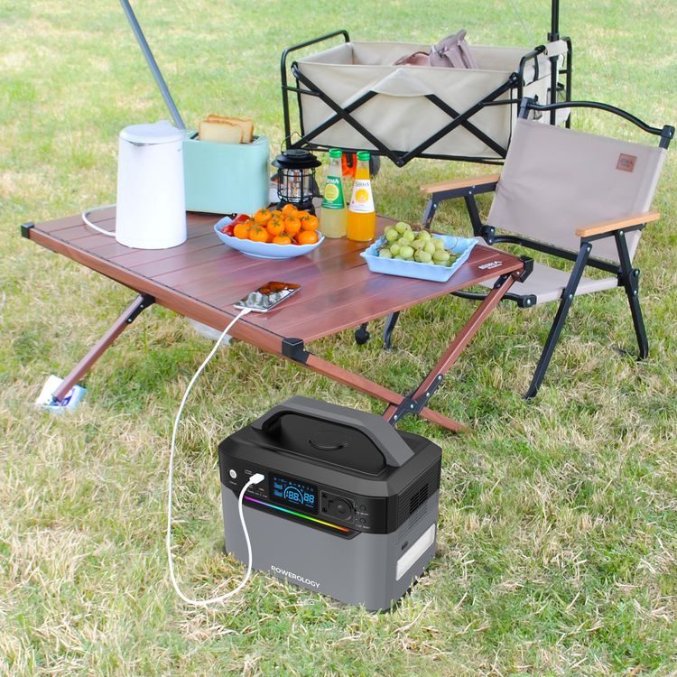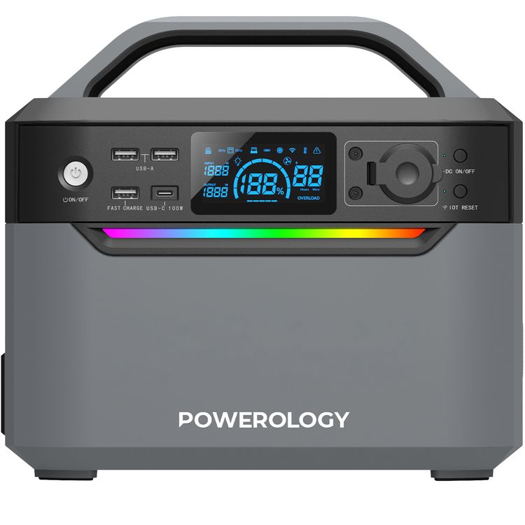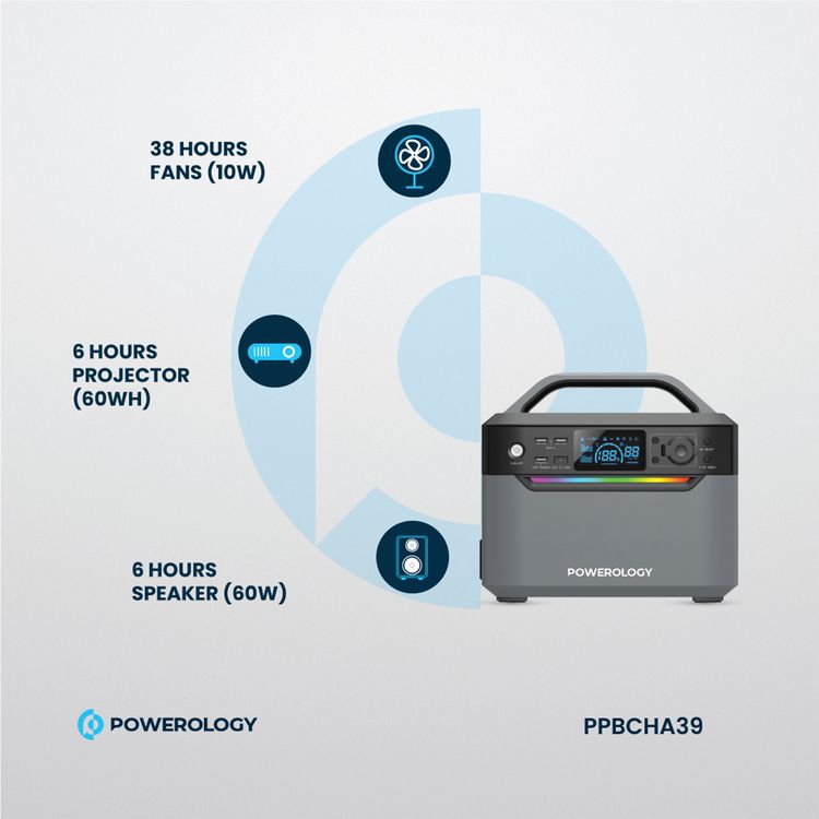 Powerology 600W Power Generator with Dual AC Sockets, USB-C, Dual USB-A & Wireless Outputs, Built-in Flashlight, 120000mAh Battery Capacity, Solar Charging Capability, Portable Design - Black