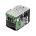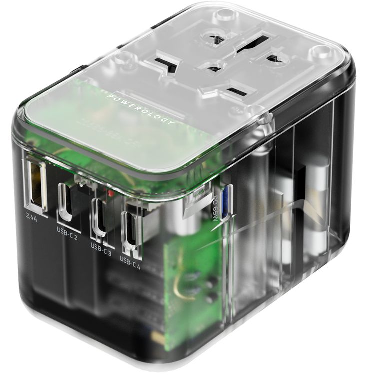 Powerology Universal Multi-Port Travel Adapter with 65W Power Delivery, Dual 10A Fuses, 12W USB-A Output, Laptop Charging Compatibility, Universal Plugs - Transparent