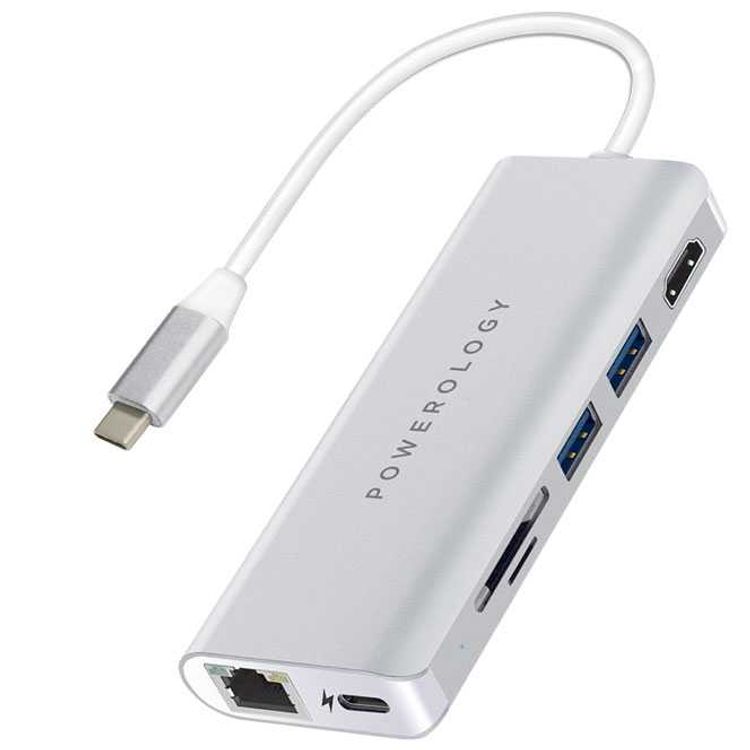 Powerology 7 in 1 USB-C Hub Ethernet & HDMI with PD 87W - Silver