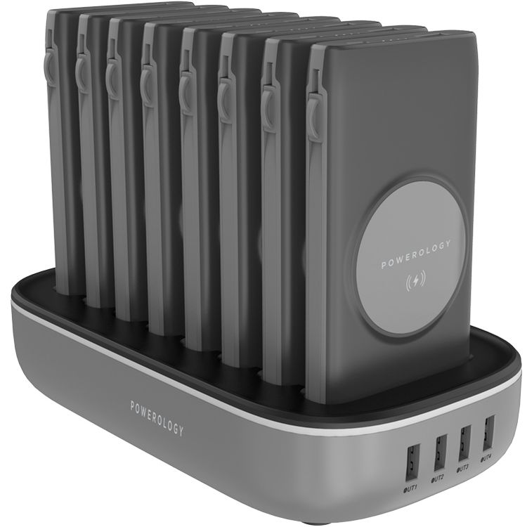 Powerology 8 in1 Power bank Station comes with 8 power packs of 10000mAh which support PD & QC 20W and Wireless charging 15W. It's equipped to charge the devices with either type-c or lightning.