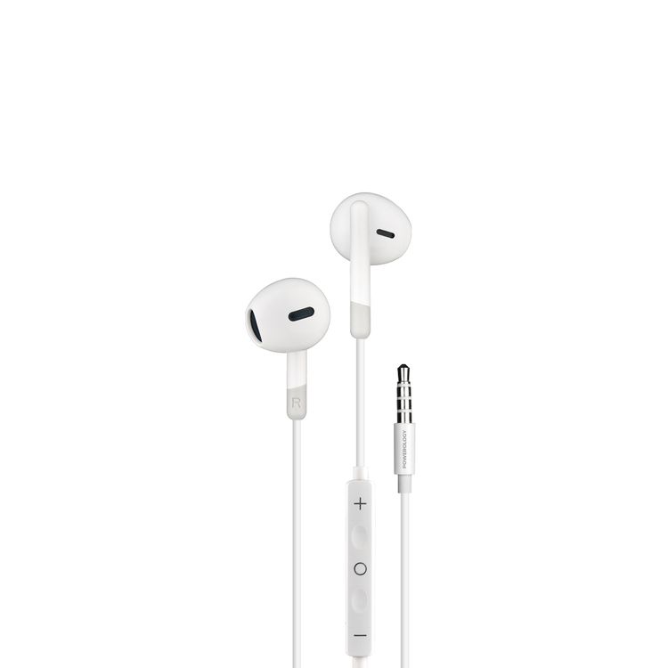 Powerology AUX 3.5mm Stereo Earphones with HD Sound Quality, In-ear Design, 1.2m Cable Length, Voice Assistant Support, In-Line Control Button - White