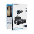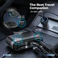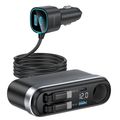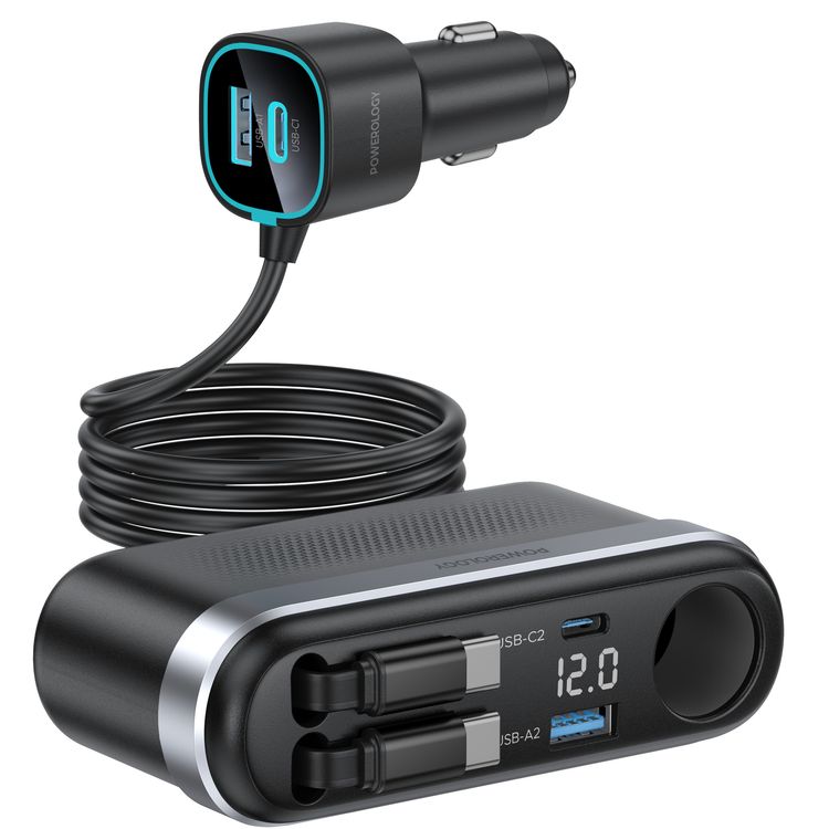 Powerology Currnex 60W Multi-Port Car Charger with 12V Socket, Dual Retractable Cables, Durable Aluminum Alloy, High-Speed Charging, Voltage Display, PD 30W, QC 30W, LED Ambient Light, Multi-Device Charging - Black
