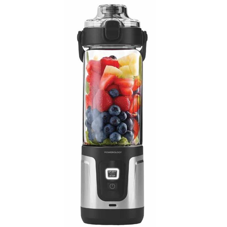 Powerology DuoMix Portable Blender with Cut Fruit & Ice Crusher, 600mL Capacity, 120W Rated Power, USB-C Charging Port, Leak-Proof Design, 2× 2000mAh Battery, 14000RPM Motor Speed, Flipping Bottom Food - Black
