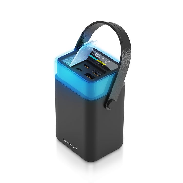 Powerology Halo Beam 40000mAh Power Bank with PD 65W, Portable Handle, Simultaneous Charging, Colorful LED Lighting, Smart Power Display, Laptop Charging - Black