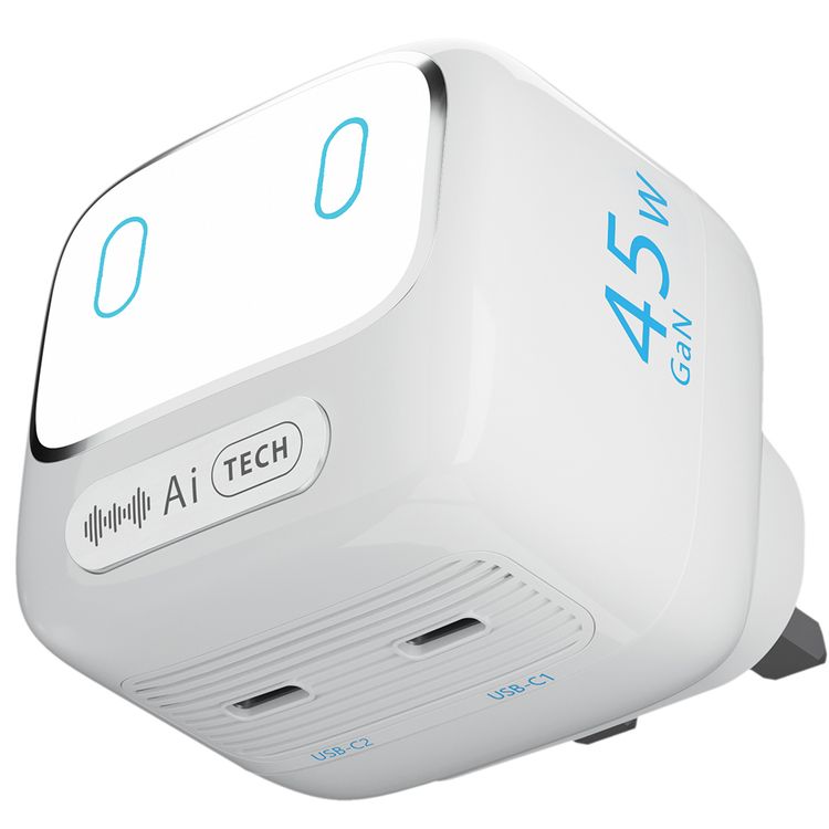Powerology Lumix GaN AI Power Charger with 45W PD Output, AI Tech, Dual USB-C Outputs, Intelligent Voice Control, Interchangeable EU & US Plugs, Built-in Safeguards, Travel Friendly - White