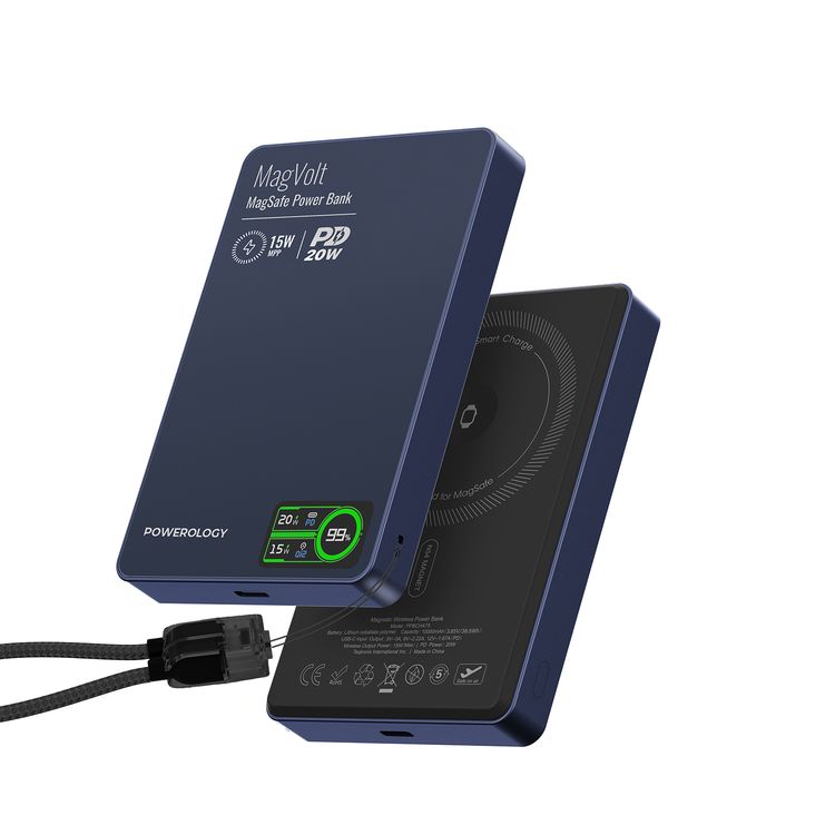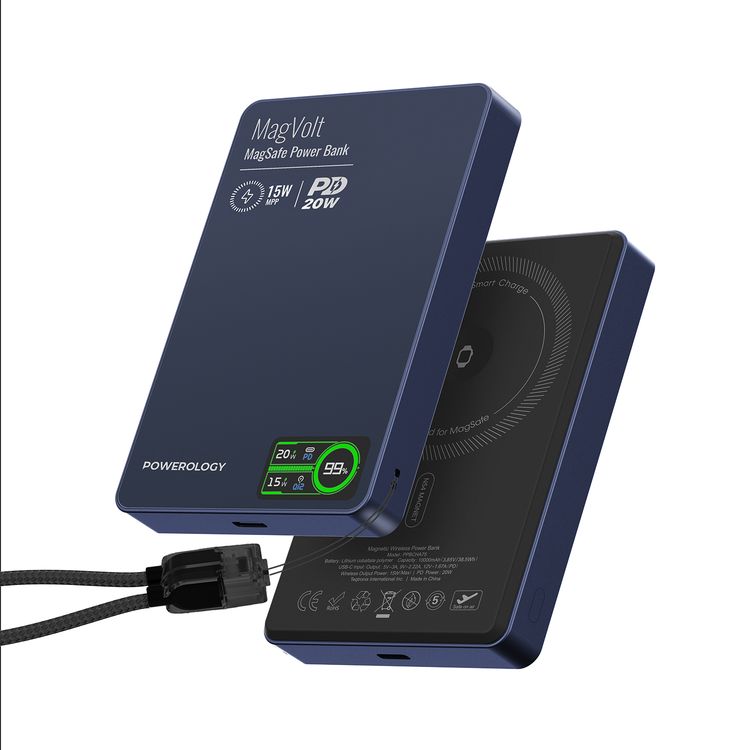 Powerology MagVolt 10000mAh Power Bank, 2.5W Watch Output, Up to 15W Phone Output, 20W Power Delivery, Ultra-Slim Design, Smart TFT Display, N54 MagSafe Compatible - Blue