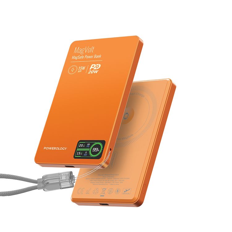 Powerology MagVolt 5000mAh Power Bank, 2.5W Watch Output, Up to 15W Phone Output, 20W Power Delivery, Ultra-Slim Design, Smart TFT Display, N54 MagSafe Compatible - Orange