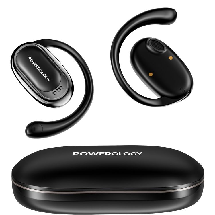 Powerology Oura Open-Ear Headphones with Enhanced Situational Awareness, Up to 8.5 Hours Battery Life, Type-C Charging Port, Bluetooth Version 5.4, 10m Bluetooth Transmission, Omnidirectional Microphone, Immersive Audio, Digital Battery Display, Ergonomic Fit - Black