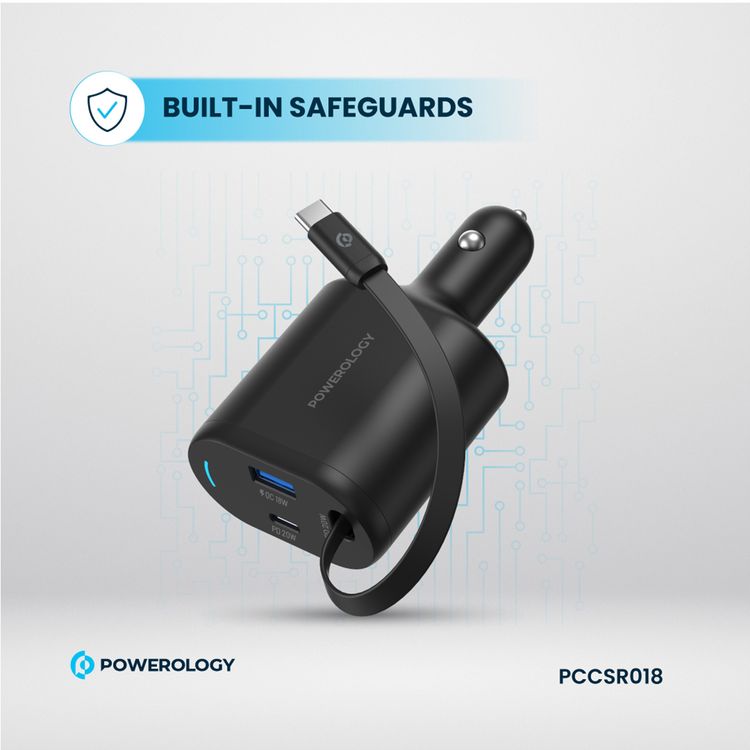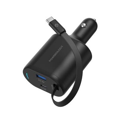 Powerology Type-C Retractable Car Charger, Dual Ports, Patented Design, Built-in Safeguards, Simultaneous Charging, Integrated Type-C Cable - Black