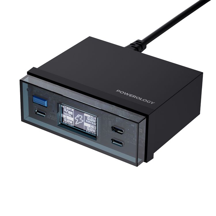 Powerology Power Hub Desktop Charging Station with ×3 USB-C & ×1 USB-A Ports, PD 65W, QC 3.0, Universal Compatibility, Digital Display - Black