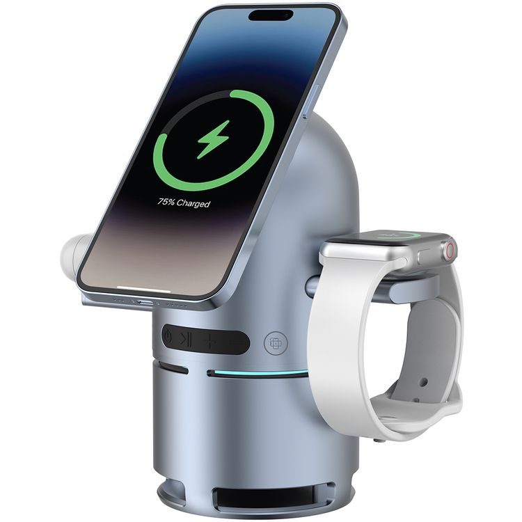 Powerology Qi2 Speaker Charge Station with Pop-Out Charging Dock, 15W Maximum Phone Output, 1000mAh Battery Capacity, Bluetooth Version 5.3, Built-in Safeguards - Gray