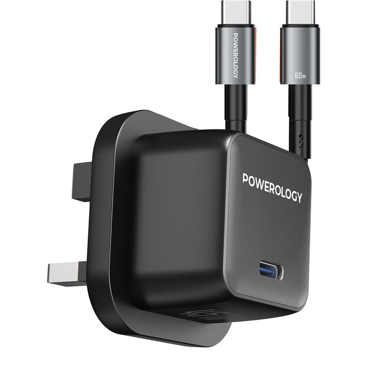Powerology QX 45W Pocket-Sized GaN Adapter with Safety Protections, 1m USB-C to USB-C Cable Included, USB-C Port, Ultra-Compact Design, UK 3-Pin Plug, PD 45W - Black / Gray
